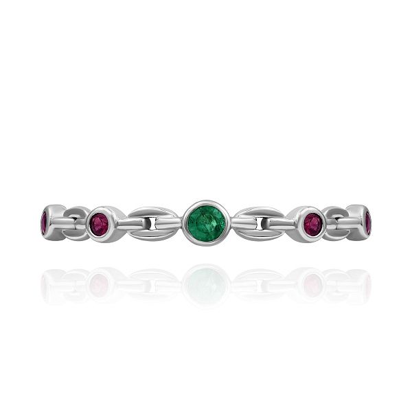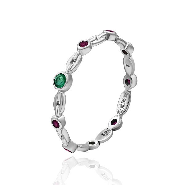 Кольцо из белого золота с изумрудом, бриллиантом и рубинами