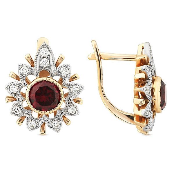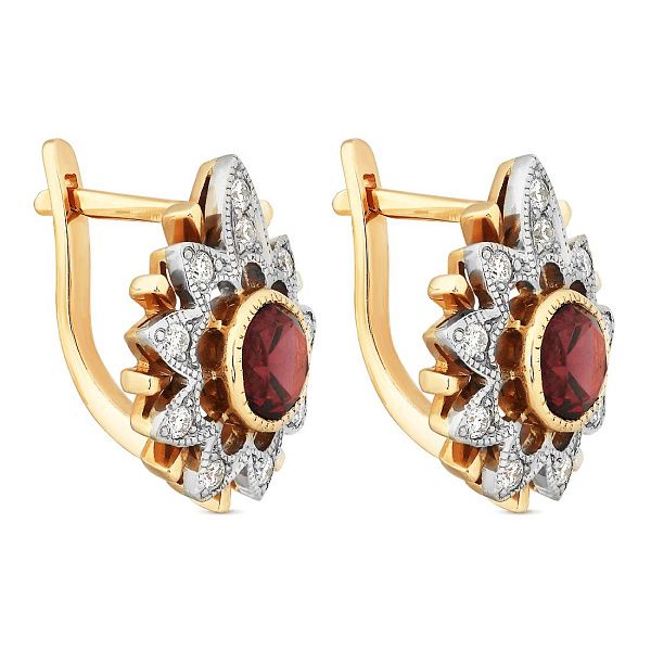 Серьги из красного золота с бриллиантами и родолитами