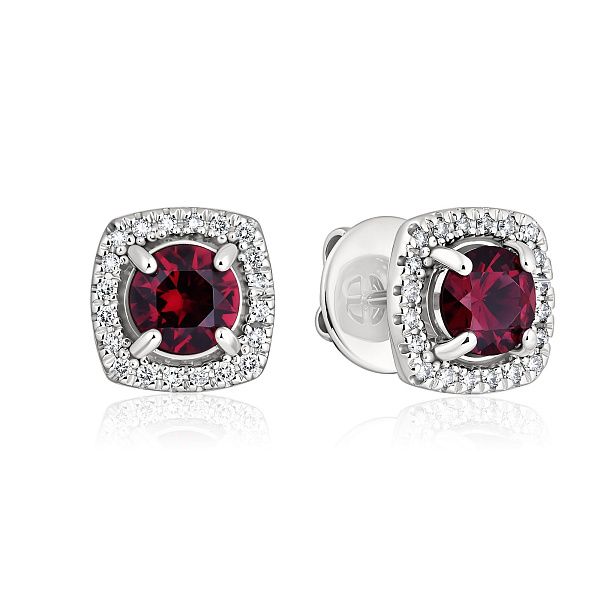 Пусеты из белого золота с бриллиантами и родолитами 1.3 ct