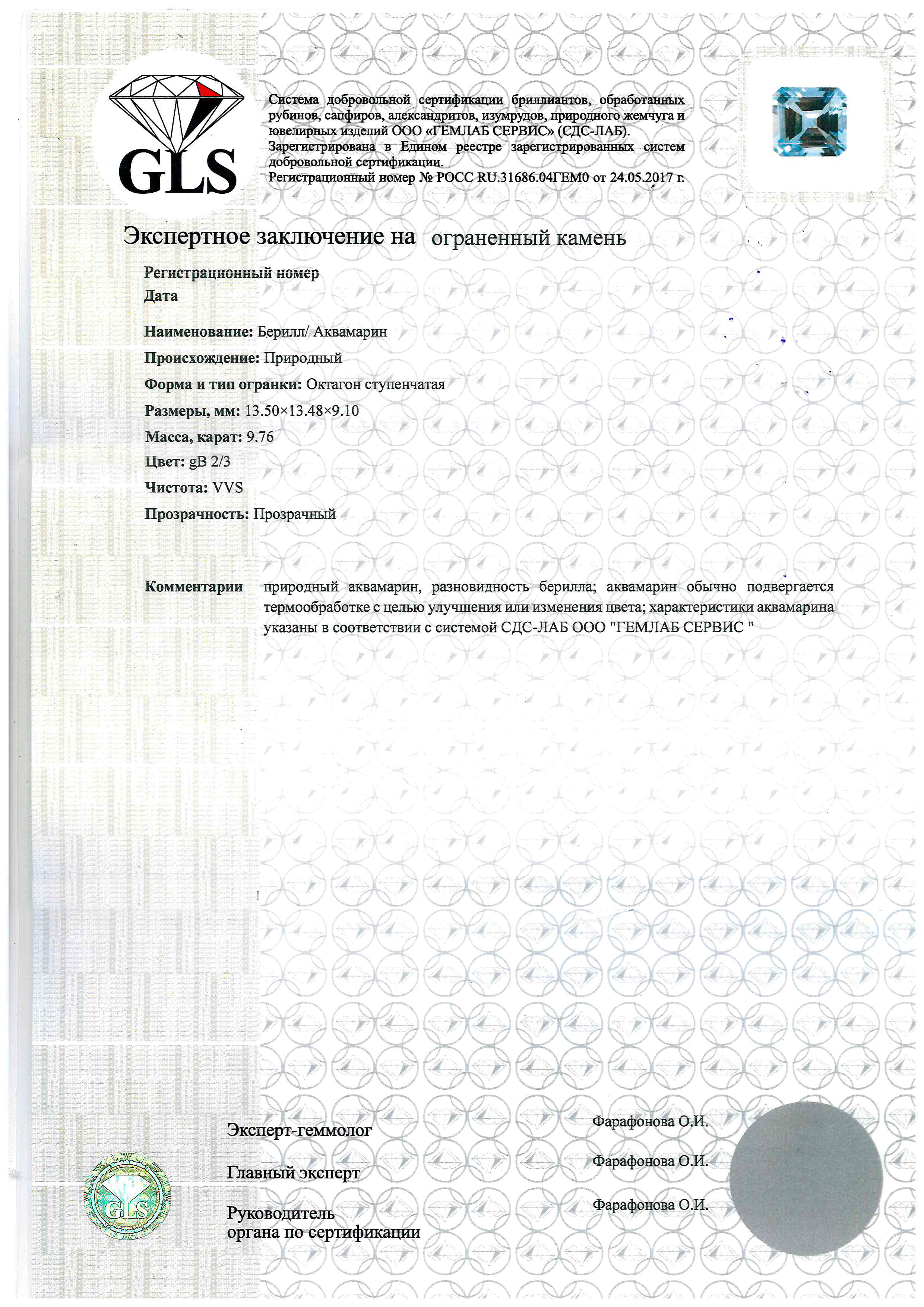 - Аквамарин - Количество: 1, Форма: «Октагон», Вес: 9.760 ct.