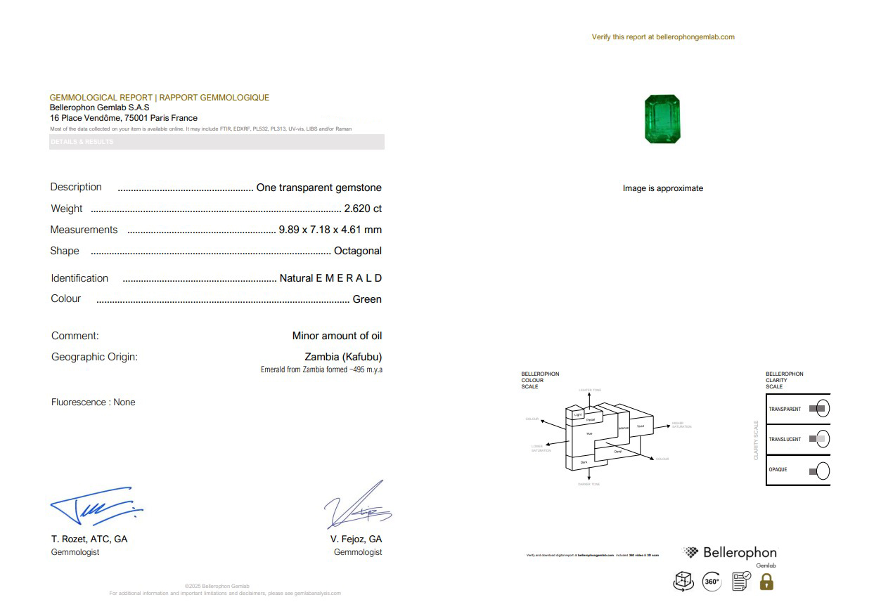 - Изумруд - Количество: 1, Форма: «Октагон», Вес: 2.620 ct.
